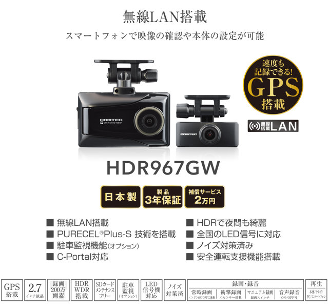 - 作品タイトル: HDR967GW / 車内撮影対応2カメラドライブレコーダー